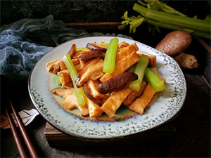 材 料:芹菜2根,香干5片,香菇4朵,生抽1汤匙,素蠔油1汤匙,盐适量