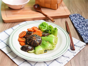 材 料:香菇200克,青菜500克,胡萝卜150克,姜5克,盐2克,素蠔油适量,玉米淀粉8克