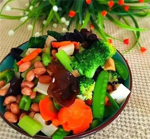 做法:食材清洗干净,木耳用凉水提前泡发,花生米用十三香加盐用水煮开,放凉备用。其他的菜分别切成块、片。西蓝花、芹菜、荷兰豆、藕用水焯一下断生即可,.捞出控干水分,锅中放油和十三香烧热,放入香菇炝锅,放入胡萝卜和豆腐干煸炒,依次放入木耳翻炒均匀,倒入焯好的各种蔬菜,煸炒均匀,放入花生米,加入盐和蘑菇粉调味,关火。翻拌均匀即可。