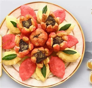 做法:将水油皮(面粉250克、水125克、糖25克、素奶油40克、食用色素-粉)和油酥(低粉200克,素奶油100克、食用色素-黄)原料分别和成面团并松弛20分钟,各分成15等份(期间要摔打几次)。取1份油皮捏扁包入1份油酥,收口朝下盖上保鲜膜松弛15分钟。取一个小面团压扁从中间上下擀开成椭圆形翻面由上至下卷起来,依次卷好后盖保鲜膜松弛15分钟,如此反复3次。黄色面团放在粉色面团上,放入龙眼肉,包成圆形,用刀子划米字,留1公分,放入油锅油炸,开花即可,装饰盛盘。