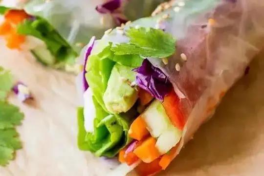 材料:1根胡萝卜、200g豆腐、1 / 4棵紫甘蓝、2个彩椒、米纸(可用春卷皮代替)、一小捆香菜、几片薄荷叶(可选),花生碎、芝麻酱、盐、胡椒粉、酱油适量。
