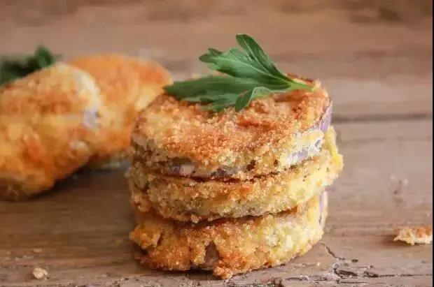 材料:1杯玉米淀粉、2个鸡蛋、1/2茶匙盐、1/2茶匙胡椒粉、1杯面包屑、2条紫茄子,植物油、柠檬适量。(全素食者可将鸡蛋去掉即可)
