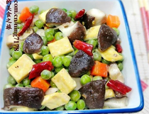 白豆干、豌豆香菇、胡萝卜丁干红辣椒段、姜末盐、蔬果粉植物油、水淀粉-做 法-1. 香菇切丁,豆干切丁备用;2. 锅中烧水,水开后将豌豆、胡萝卜丁和香菇丁分别煮至7分熟,捞出;3. 热锅倒油,油热后下姜末、干红辣椒段爆香;4. 放入豆腐干炒至变色;5. 倒入豌豆、胡萝卜、香菇丁翻炒均匀;6. 加入盐、蔬果粉调味,最后水淀粉勾芡,淋少许香油提味即可出锅。