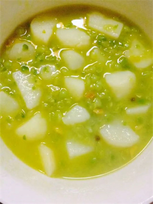 1. 新鲜豌豆煮熟,锅内少许盐;2. 煮熟的豌豆捞出过凉水,多过几次,保证豌豆碧绿的色彩;3. 土豆削皮切成小块;4. 热锅入油,放入生姜末和花椒,小火炒土豆2分钟;5. 加水盖上炖煮,先大火5分钟;6. 5分钟后加入豌豆碎,盖上小火5分钟;7. 少量盐和蔬果粉调味出锅。