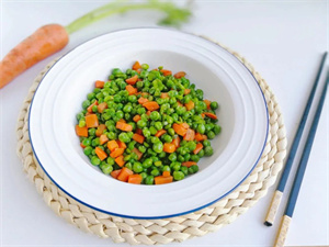 1. 剥好的豌豆洗净,胡萝卜切丁;2. 水烧开焯水倒入少许盐和油,保持鲜嫩的颜色;3. 热锅冷油,倒入大火翻炒2分钟;4. 倒入适量的盐调味即可。