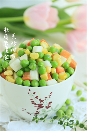 1. 青豌豆掰去豆荚,玉米从棒子上掰下来,胡萝卜切丁,山药切丁;2. 锅底少许油爆香姜丝;3. 倒入所有的食材翻炒2-3分钟后加盐;4. 出锅前加入少许淀粉水翻炒均匀后加入一勺芝麻油提味。