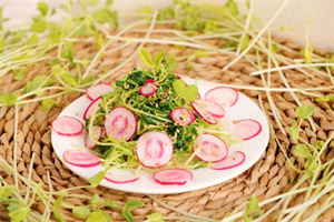 1. 热锅入水,水开后豌豆苗焯水1分钟;2. 捞出过冷水,樱桃萝卜切薄片,调味料挤入柠檬汁、淋入橄榄油调拌均匀;3. 将滤干水分的豌豆苗和萝卜片放入碗中,入调料拌匀;4. 装盘,撒上熟白芝麻提香。