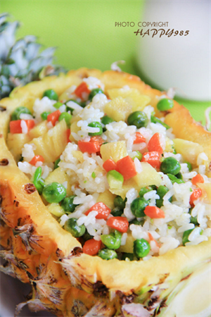 菠萝1个、胡萝卜半个米饭1碗、豌豆适量油、盐、素蠔油适量