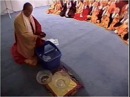 当宣布打开衣钵时, 果然佛陀降下了甘露,这是什么甘露?不言而喻,当然是阿弥陀佛降下的真精甘露,确实不是人间的物品能代替的,因为这甘露在跳动,是具有灵魂生命力的,而且异香扑鼻,降甘露的同时,钵中还降下了一百多颗五彩舍利。