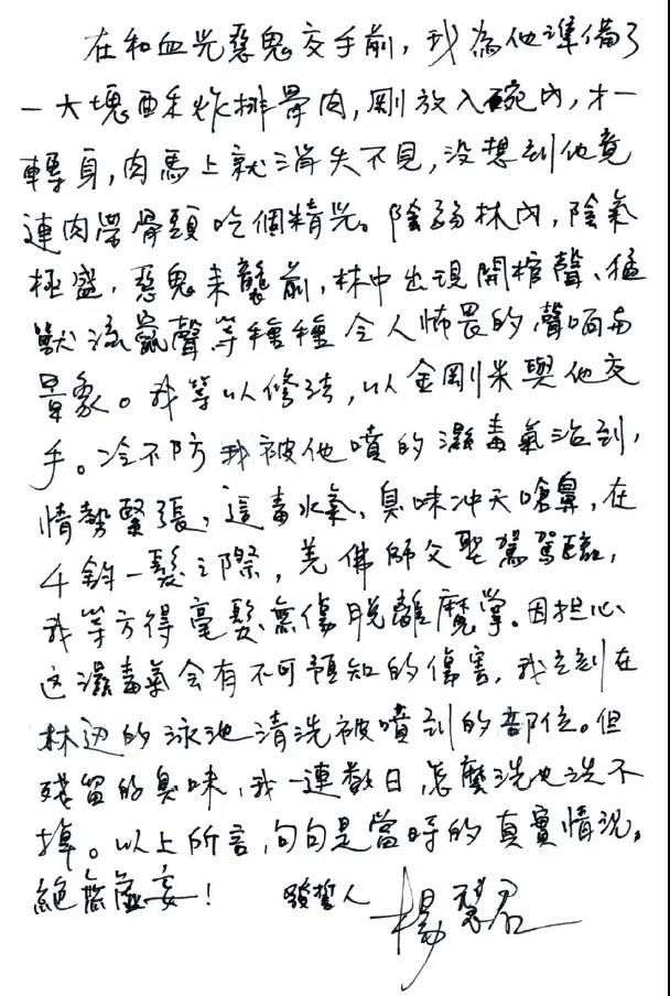 凡是参加过的人,都说实在太恐怖了,有人当场吓得尿湿裤子,有的人吓得走不动了,直打哆嗦,贡拉仁波切师兄见到血光鬼从照片中走出来,突然扑向他,师兄用佛陀师父加持的金刚米,使用他在高中念书就学会的天女散花式,向血光鬼射击,果然把血光鬼打倒在地上,师兄上前检验是否将此恶鬼毙命,他刚弯下腰去看恶鬼的五官时,这恶鬼突然来一个冷不防,一口尸毒水喷出,奇臭无比,师兄的五官立刻变形走位,大家看了他的五官变形走位,也吓得不得了。另有杨慧君师姐想安慰血光厉鬼,专门准备了一大块酥炸排骨肉去供养,心想这样恐怕会好一点,排骨肉刚刚放下去,很快地,血光厉鬼从照片中冲出来,把排骨肉连骨带肉“嘁哩喀啦”一口就吞下去了,吓得杨慧君师姐全身哆嗦,而且也没有因此就放过杨慧君师姐,还向她喷了一口尸毒气,全身尸臭难闻,当场就在游泳池中洗,可是臭味洗都洗不掉。